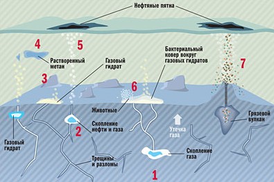 2) Метан скапливается в осадочных породах, образуя полости, наполненные газом. С ростом давления он просачивается наружу.